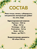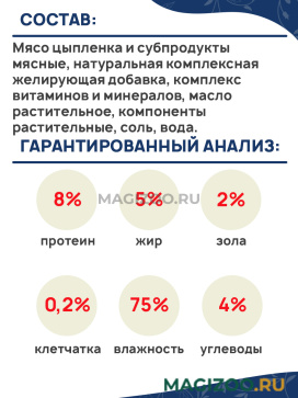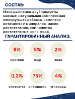 Мясо цыпленка и субпродукты мясные, натуральная комплексная желирующая добавка, комплекс витаминов и минералов, масло растительное, компоненты растительные, соль, вода.