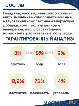 Говядина, мясо индейки, мясо кролика, мясо цыпленка и субпродукты мясные, натуральная комплексная желирующая добавка, комплекс витаминов и минералов, масло растительное, компоненты растительные, соль, вода.