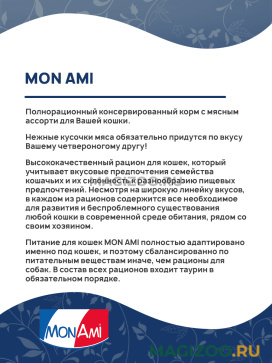 Информация о составе и ингредиентах, цветовом решении, технических и иных характеристиках, стране-изготовителе, внешнем виде и комплекте поставки товара носит справочный характер и основана на последних доступных к моменту публикации сведениях. Доставка данного товара осуществляется во все регионы РФ.Известный на сегодняшний день бренд MON AMI - это результат сотрудничества России и Дании, которые создали высокотехнологичную линию сухих и консервированных кормов для домашних животных.
