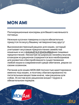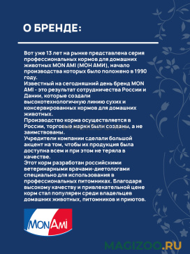 Информация о составе и ингредиентах, цветовом решении, технических и иных характеристиках, стране-изготовителе, внешнем виде и комплекте поставки товара носит справочный характер и основана на последних доступных к моменту публикации сведениях. Доставка данного товара осуществляется во все регионы РФ.Известный на сегодняшний день бренд MON AMI - это результат сотрудничества России и Дании, которые создали высокотехнологичную линию сухих и консервированных кормов для домашних животных.