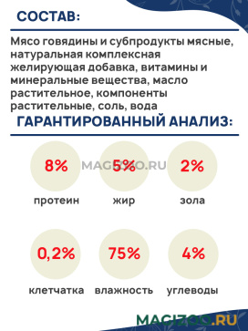 Мясо говядины и субпродукты мясные, натуральная комплексная желирующая добавка, витамины и минеральные вещества, масло растительное, компоненты растительные, соль, вода