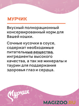 Сочные кусочки в соусе, содержат необходимые питательные вещества, ингредиенты высокого качества, а так же минералы и таурин для поддержания здоровья глаз и сердца.
