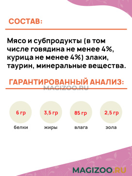 Мясо и субпродукты (в том числе говядина не менее 4%, курица не менее 4%) злаки, таурин, минеральные вещества.