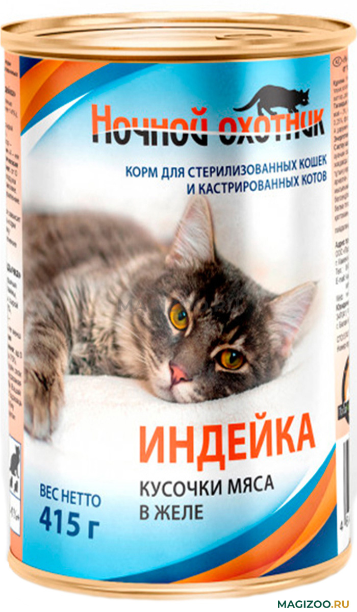 Данный вид корма хорошо сбалансирован и благоприятно влияет на организм Вашего питомца после стерилизации. В консервах Ночной охотник для стерилизованных кошек большей составляющей частью является диетическое мясо индейки-лучший источник животного белка, который необходим животному для восстановления организма.