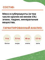 Мясо и субпродукты животного происхождения (мясо кролика не менее 10 %, сердце не менее 10 %), растительное масло, злаки, минеральные вещества, витамины А, D3, E (tocopherol), таурин.