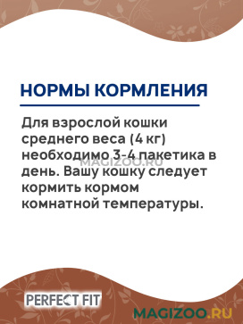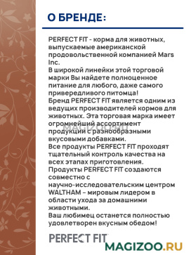 Бренд PERFECT FIT является одним из ведущих производителей кормов для животных. Эта торговая марка имеет огромнейший ассортимент продукции с разнообразными вкусовыми добавками.