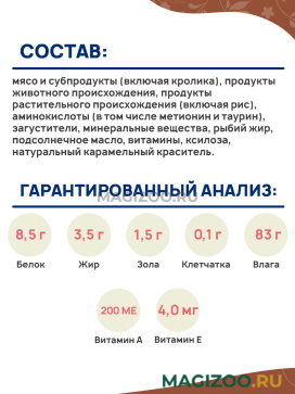 Состав: мясо и субпродукты (включая кролика), продукты животного происхождения, продукты растительного происхождения (включая рис), аминокислоты (в том числе метионин и таурин), загустители, минеральные вещества, рыбий жир, подсолнечное масло, витамины, ксилоза, натуральный карамельный краситель.