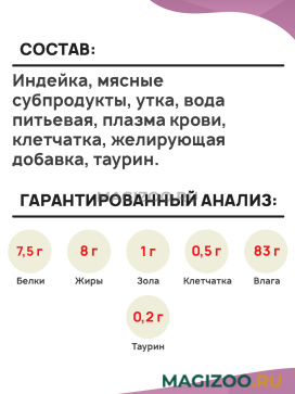 Индейка, мясные субпродукты, утка, вода питьевая, плазма крови, клетчатка, желирующая добавка, таурин.