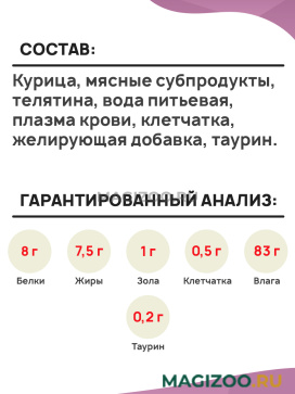 Курица, мясные субпродукты, телятина, вода питьевая, плазма крови, клетчатка, желирующая добавка, таурин.