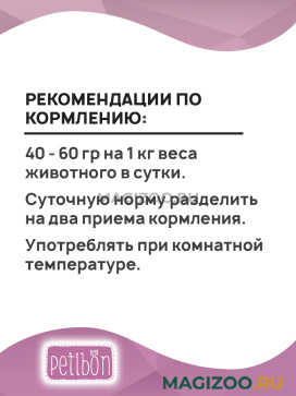 Информация о составе и ингредиентах, цветовом решении, технических и иных характеристиках, стране-изготовителе, внешнем виде и комплекте поставки товара носит справочный характер и основана на последних доступных к моменту публикации сведениях. Доставка данного товара осуществляется во все регионы РФ.Под брендом PETIBON выпускаются разнообразные корма для собак и кошек. Технологии и рецептуры разработаны при участии ветеринарных диетологов. Компания строго придерживается принципов сохранения природных компонентов в питании и для изготовления всей продукции используем только высококачественное натуральное сырье. Продукция компании производится на современном зарубежном оборудовании и проходит строгий контроль качества на всех стадиях производства.