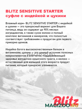 Влажный корм- BLITZ SENSITIVE STARTER с индейкой и цукини — это прекрасный вариант для Вашего питомца, ведь он содержит до 90% мясных ингредиентов, а также сухое молоко и полный комплекс витаминов и минералов, что полностью соответствует требованиям к продуктам для первого прикорма щенков.