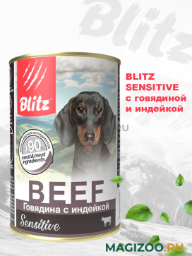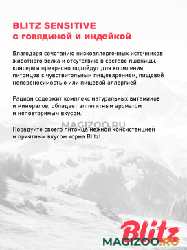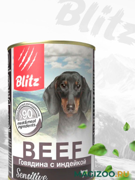 Корм Blitz изготовлен из двух видов нежного мяса — говядины и индейки.