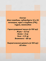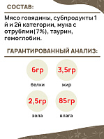 Мясо говядины, субпродукты 1й и 2й категории, мука с отрубями(7%), таурин, гемоглобин.