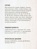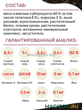 Состав: мясо и мясные субпродукты 60 % (в том числе телятина 8 %), морковь 2 %, мука рисовая, мука пшеничная, растительный белок, плазма крови, растительная клетчатка, витаминно-минеральный комплекс, загуститель.