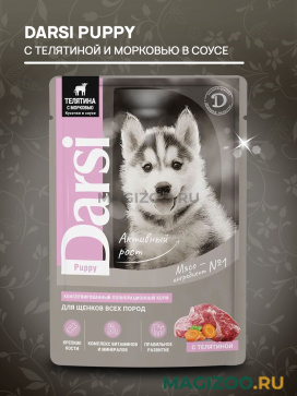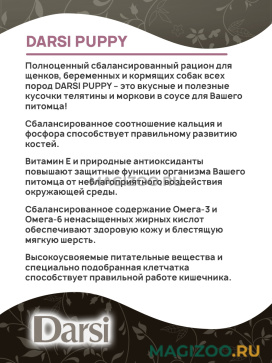 Полноценный сбалансированный рацион для щенков, беременных и кормящих собак всех пород DARSI PUPPY – это вкусные и полезные кусочки телятины и моркови в соусе для Вашего питомца!