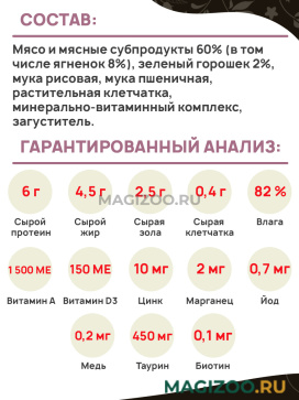 Мясо и мясные субпродукты 60% (в том числе ягненок 8%), зеленый горошек 2%, мука рисовая, мука пшеничная, растительная клетчатка, минерально-витаминный комплекс, загуститель.