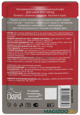 Полноценный сбалансированный рацион для взрослых собак всех пород DARSI ADULT – это вкусные и полезные кусочки ягненка с зеленым горошком в соусе для Вашего питомца!