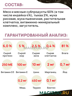 Мясо и мясные субпродукты 60% (в том числе индейка 4%), тыква 2%, мука рисовая, мука пшеничная, растительная клетчатка, витаминно-минеральный комплекс, загуститель.