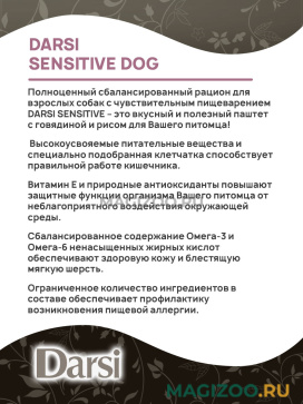 Полноценный сбалансированный рацион для взрослых собак с чувствительным пищеварением DARSI SENSITIVE – это вкусный и полезный паштет с говядиной и рисом для Вашего питомца!