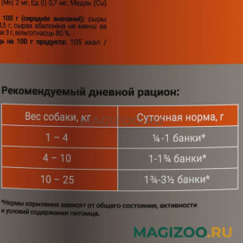 Мясо и мясные субпродукты 65 % (в том числе говядина не менее 15 %, курица не менее 15 %), мясной бульон, рис, морковь, растительное масло, витаминно-минеральный комплекс, натуральный загуститель.
