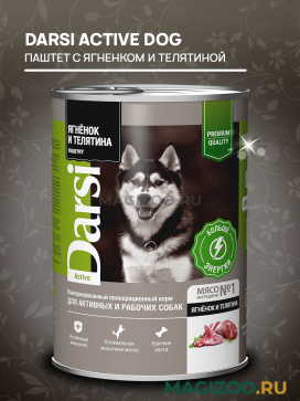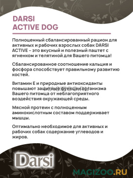 Полноценный сбалансированный рацион для активных и рабочих взрослых собак DARSI ACTIVE – это вкусный и полезный паштет с ягненком и телятиной для Вашего питомца!