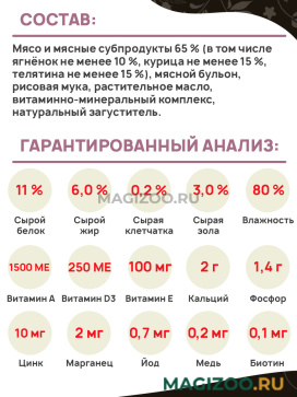 Мясо и мясные субпродукты 65 % (в том числе ягнёнок не менее 10 %, курица не менее 15 %, телятина не менее 15 %), мясной бульон, рисовая мука, растительное масло, витаминно-минеральный комплекс, натуральный загуститель.