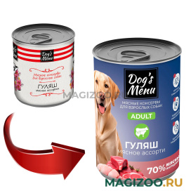 Оптимальный сбалансированный рацион для создания комфортной жизни, удовольствия и гармонии Вам и Вашей собаке. Побалуйте своего питомца полноценным обедом с гуляшом из мясного ассорти!