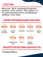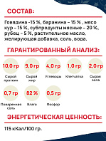 Говядина -15 %, баранина – 15 % , мясо кур – 15 %, субпродукты мясные – 20 %, рубец – 5 %, растительное масло, желирующая добавка, соль, вода.