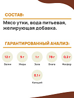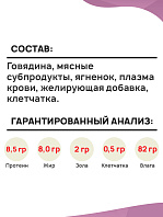 Говядина – 30 %, субпродукты мясные (печень – 20 %, рубец – 10 %, сердце – 10 %, растительное масло, желирующая добавка, соль, вода.