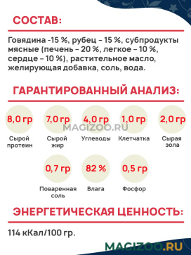 Говядина -15 %, рубец – 15 %, субпродукты мясные (печень – 20 %, легкое – 10 %, сердце – 10 %), растительное масло, желирующая добавка, соль, вода.