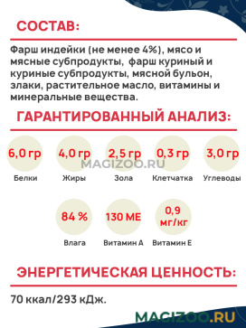 Фарш индейки (не менее 4%), мясо и мясные субпродукты, фарш куриный и куриные субпродукты, мясной бульон, злаки, растительное масло, витамины и минеральные вещества.
