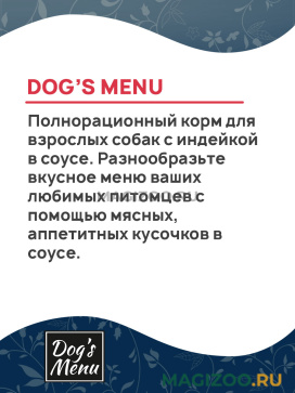 Полнорационный корм для взрослых собак с индейкой в соусе. Разнообразьте вкусное меню ваших любимых питомцев с помощью мясных, аппетитных кусочков в соусе.