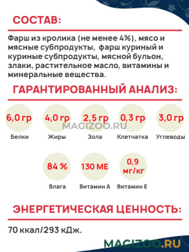 Фарш из кролика (не менее 4%), мясо и мясные субпродукты, фарш куриный и куриные субпродукты, мясной бульон, злаки, растительное масло, витамины и минеральные вещества.