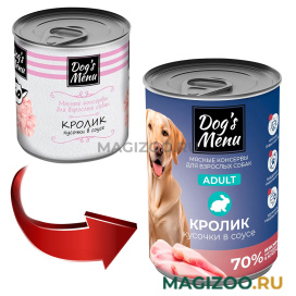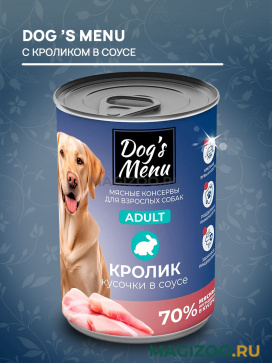 Полнорационный корм для взрослых собак с кроликом в соусе. Разнообразьте вкусное меню ваших любимых питомцев с помощью мясных, аппетитных кусочков в соусе.