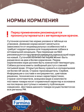 При переводе на N&D рекомендуется постепенно замещать предыдущий корм на новый. Суточное количество корма может быть разделено на два и более кормления. Перед кормлением корм должен быть комнатной температуры.