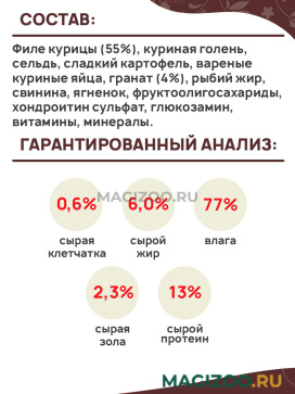 Филе курицы (55%), куриная голень, сельдь, сладкий картофель, вареные куриные яйца, гранат (4%), рыбий жир, свинина, ягненок, фруктоолигосахариды, хондроитин сульфат, глюкозамин, витамины, минералы.