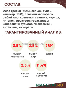 Филе трески (30%), сельдь, тунец, кальмар (10%), сладкий картофель, рыбий жир, креветки, свинина, курица, ягненок, фруктоолигосахариды, хондроитин сульфат, глюкозамин, витамины, минералы.