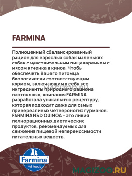 FARMINA N&D QUINOA – это линия полнорационных диетических продуктов, рекомендуемых для снижения пищевой непереносимости питательных веществ.