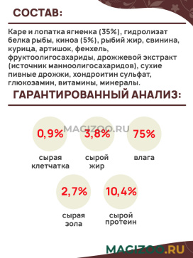 Каре и лопатка ягненка (35%), гидролизат белка рыбы, киноа (5%), рыбий жир, свинина, курица, артишок, фенхель, фруктоолигосахариды, дрожжевой экстракт (источник манноолигосахаридов), сухие пивные дрожжи, хондроитин сульфат, глюкозамин, витамины, минералы.