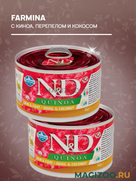 FARMINA N&D QUINOA – это линия полнорационных диетических продуктов, рекомендуемых для снижения пищевой непереносимости питательных веществ.