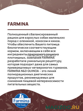 FARMINA N&D QUINOA – это линия полнорационных диетических продуктов, рекомендуемых для снижения пищевой непереносимости питательных веществ.