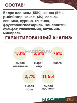 Бедро оленины (55%), киноа (5%), рыбий жир, кокос (4%), сельдь, свинина, курица, ягненок, фруктоолигосахариды, хондроитин сульфат, глюкозамин, витамины, минералы.