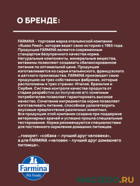 Информация о составе и ингредиентах, цветовом решении, технических и иных характеристиках, стране-изготовителе, внешнем виде и комплекте поставки товара носит справочный характер и основана на последних доступных к моменту публикации сведениях. Доставка данного товара осуществляется во все регионы РФ.Продукция FARMINA является современным стандартом безупречного качества корма. Натуральные компоненты, минеральные вещества, витамины позволяют создавать сбалансированное питание по оптимальной цене. Продукция изготавливается из сырья итальянского, французского и датского производства. FARMINA производит свою продукцию на трех собственных фабриках, которые расположены в трех странах: Италия, Бразилия и Сербия.