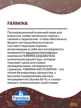 FARMINA N&D PUMPKIN - это линия беззерновых продуктов, с высоким содержанием мясных ингредиентов (более 60 %) и тыквы – овоща с уникальными свойствами.