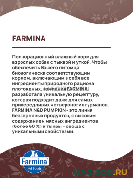 FARMINA N&D PUMPKIN - это линия беззерновых продуктов, с высоким содержанием мясных ингредиентов (более 60 %) и тыквы – овоща с уникальными свойствами.