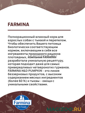 FARMINA N&D PUMPKIN - это линия беззерновых продуктов, с высоким содержанием мясных ингредиентов (более 60 %) и тыквы – овоща с уникальными свойствами.
