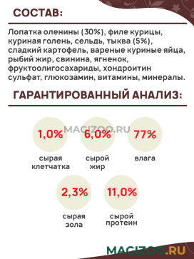 Лопатка оленины (30%), филе курицы, куриная голень, сельдь, тыква (5%), сладкий картофель, вареные куриные яйца, рыбий жир, свинина, ягненок, фруктоолигосахариды, хондроитин сульфат, глюкозамин, витамины, минералы.