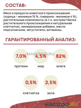 Корм состоит из натуральных ингредиентов, полностью сбалансирован и может применяться как самостоятельный рацион либо в комбинации с сухими кормами «Наша Марка».
