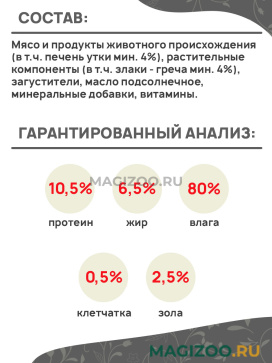 Мясо и продукты животного происхождения (в т.ч. печень утки мин. 4%), растительные компоненты (в т.ч. злаки - греча мин. 4%), загустители, масло подсолнечное, минеральные добавки, витамины.