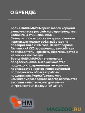 Бренд НАША МАРКА – это команда профессионалов, высокое качество продукции, современные технологии производства кормов, инновационный подход во всех областях работы предприятия. Корма Гатчинского комбикормового завода всегда отличаются высоким качеством, натуральными ингредиентами и разумной ценой.